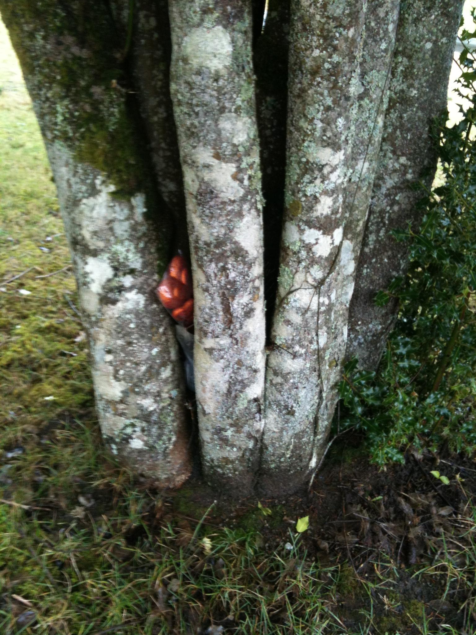 This comes to mind because just the other day I was walking by a tree that I walk by on a regular basis. I always admire it’s height and the breadth of its limbs. I never took the time to look closely at the base of its trunks or anywhere else. Just the other day, I was walking on a path I sometimes do and noticed this crammed amind the trunks.