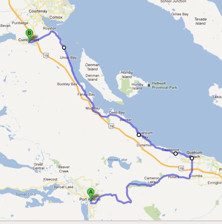 Today was a good ride day and YES I was able to get on the bike today. A group of us left Port Alberni and headed up and over the Alberni Summit (aka “The Hump” by the locals) and headed to the east coast of Van Isle. We met up with another rider at the Beach Hut in Qualicum and headed north along the old Island Highway. The day was clear and sunny, the water of the Pacific was blue, the traffic was light and the bikes ran well and ate up the miles