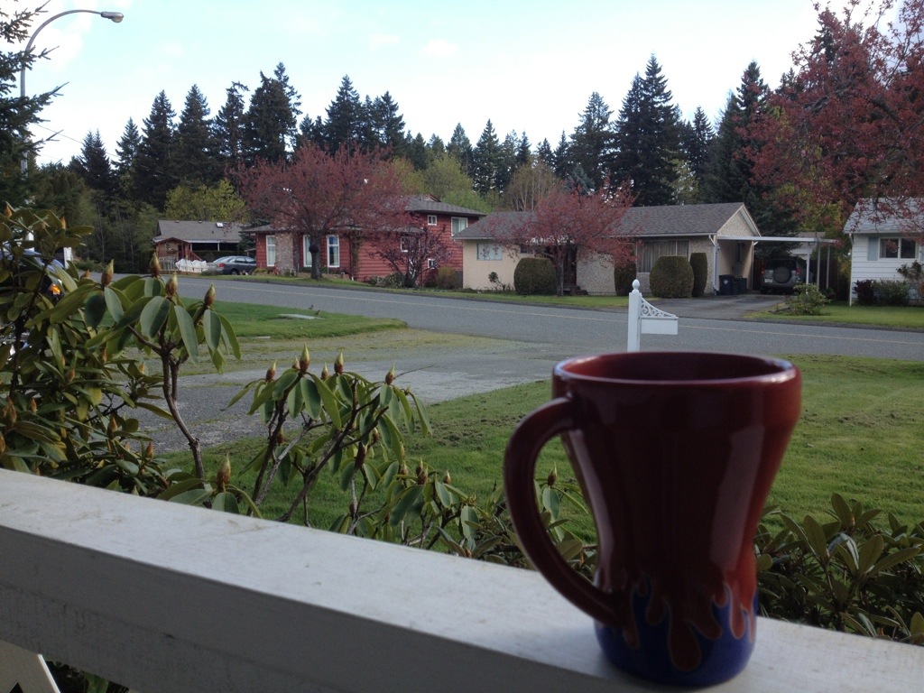 Morning in the Alberni Valley is a wonderful thing in spring/ summer. The cherry trees bud out. The robins cruise the yards in the neighbourhood. The sun comes out on my favourite morning tea stop. All is right with the world from my front breezeway.