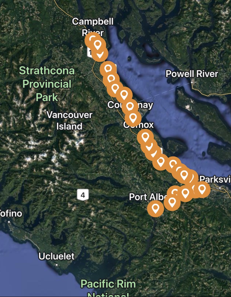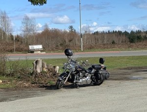We left the Valley at 11am. A bit of a shock to se that ‘tourist traffic’ (bumper to bumper and 25 car long line) has already begun, which kept us at a constant 60km in an 80km zone. We stopped in on the east coast of the Island to pick up a few more riders then headed up to the north island via the ‘old highway’ aka 19A. Traffic on the old highway wasn’t too bad and the sun was shining. The only time Mother Nature had a bit of a temper jag was just before Courtenay, where a rain squall turned and we were pelted with hail. They were small little ice pellets – which still hurt at 80km/hr. Luckily i have a full windshield. No fairing meant my hands took the beating.