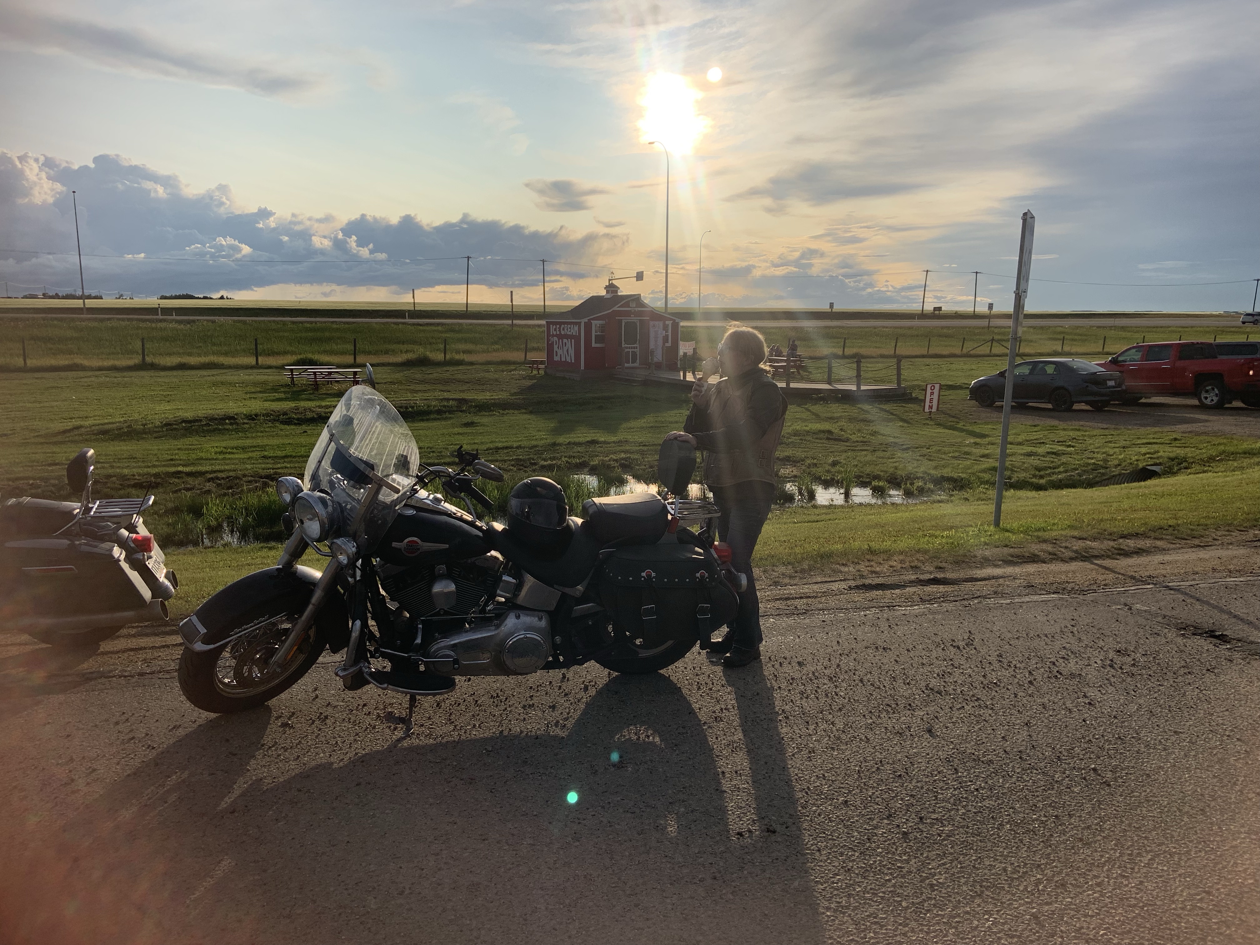 It’s at times like this I like to go through some of my ride photos from prior years. I sometimes stumble across ones that bounce me back in time. Like this one. During a 2 week ride ( 9 days of which were rain) but we found an ice cream joint in Grande Prairie and were able to take some times to just enjoy the sun, and – of course- the ice cream. As you can see from my windshield, caked with dirty water and a usually chrome bike it was a particularly filth ride day. But the ice cream…. mmmmmm…